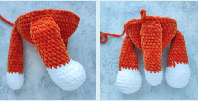 IMPORTANT! We knit the tail at the end of one row and at the beginning of another, so that it is exactly in the middle. Also, the Magic Rings are crocheted on the arms and legs, they should be exactly on top of each other.
