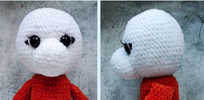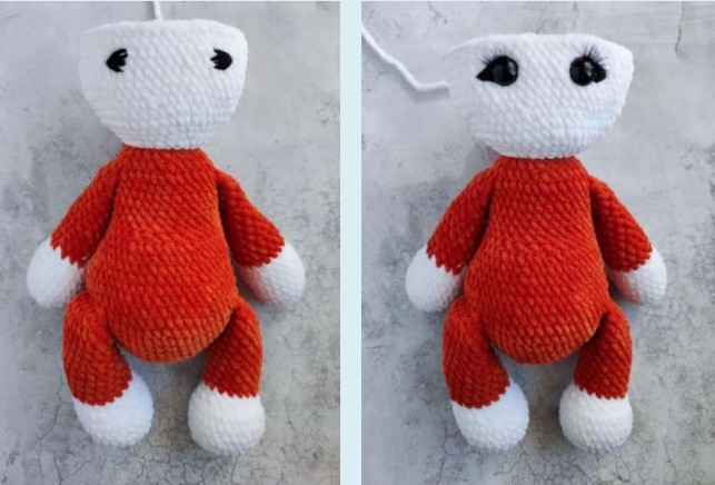 Sew the ınc cap 2-3 rows above the eyes. So that the tip of the nose is in the middle of the muzzle. Embroider eyebrows, stripes at the nose of the Magic Ring and a smile.